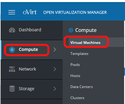 To export a virtual server to an Export Domain, it is necessary to go to the Compute - Virtual Machines section: