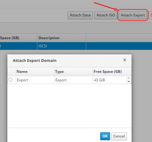 2. In the opened window in the Storage section, click on Attach Export and select Export Domain, click on OK: