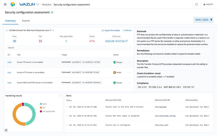 1. High client quality. The client part of Wazuh turned out to be the least resource-intensive, but at the same time stable and reliable. The mechanism for detecting, viewing, and comparing open source security compliance is important, but as secondary software. Accordingly, it should not place undue load on the server. If 50% of the server’s resources go to monitoring, then something is not working right.