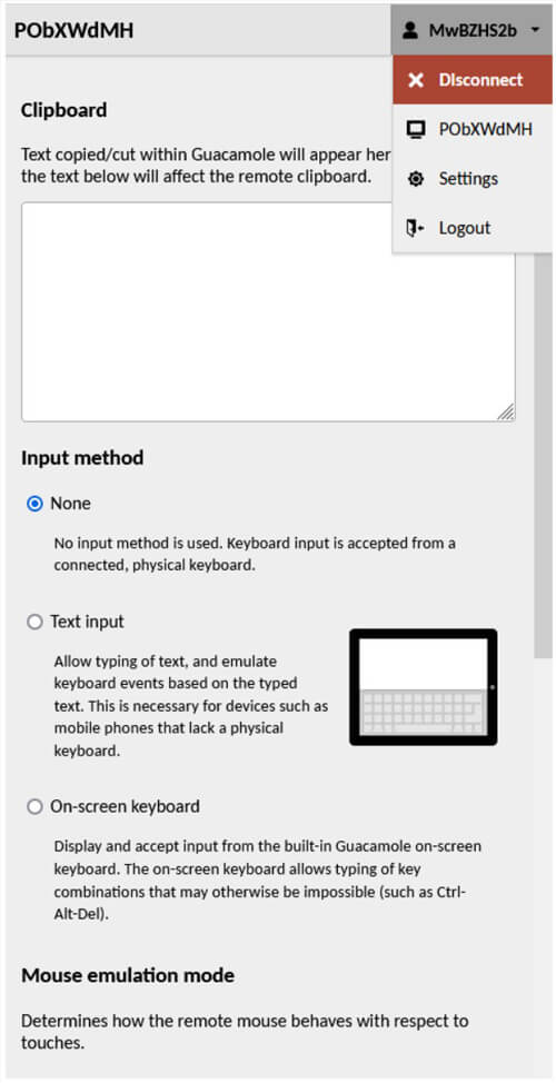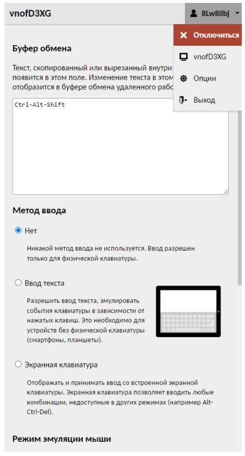 Certain key combinations cannot be pressed in the web application because they are reserved by the OS (e.g. Ctrl-Alt-Del or Alt-Tab) or by the browser. This problem can be solved by calling the Apache Guacamole navigation menu with the Ctrl-Alt-Shift key combination (you can hide the menu by pressing the combination again). There you can select the input method (text, on-screen keyboard), enable mouse emulation mode, select the language and time zone, and close the work session.
