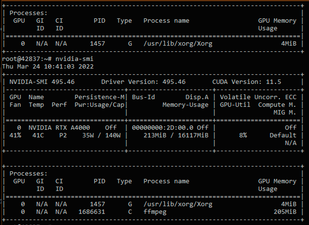 We start with one ffmpeg stream with encoding through h264_nvenc. We make sure through the output of the nvidia-smi that we actually have the video card involved: