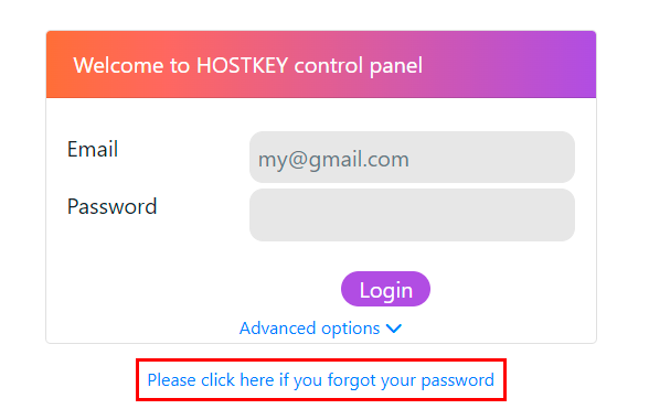 If you have forgotten your password, go to https://invapi.hostkey.com, enter the email address associated with your account, and click on the Please click here if you forgot your password link: