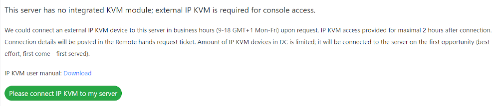We can connect an external IP KVM device to the server upon request during business hours: 9-18 GMT + 1, Mon-Fri. You can request it via API. The IP KVM access is provided for a maximum of 2 hours after connection. The access data will be provided in the ticket request of the “remote hands”.