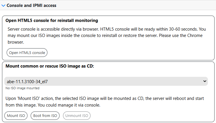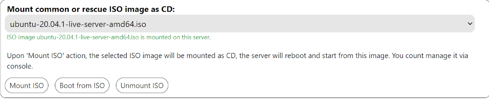 After the Mount ISO action, the selected ISO image will be mounted as a CD, the server will be rebooted and started from this image. You can manage the server through the console.