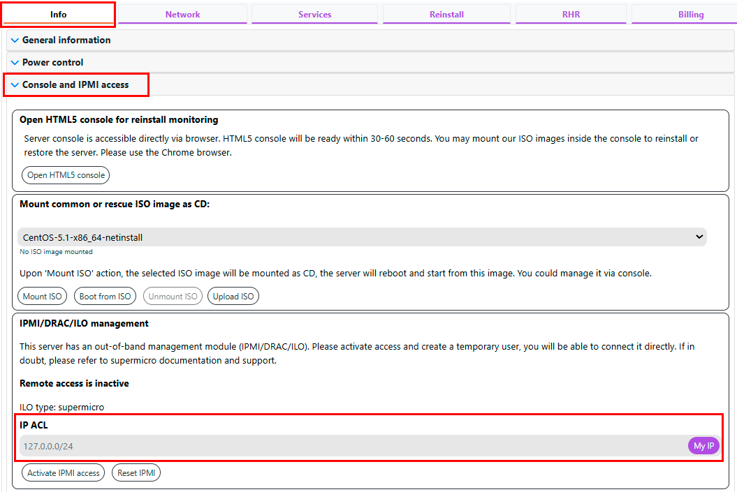 The various options for direct remote access to hardware management are provided in the Info >> Console and IPMI access tab.