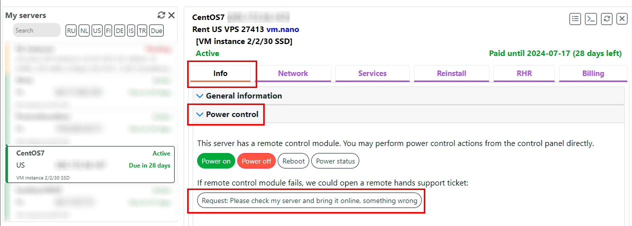 Go to the Invapi hardware control panel. In the server card, go to the Info >> Power control tab, click on the button Request: Check my server and connect it to the network, something's not right: