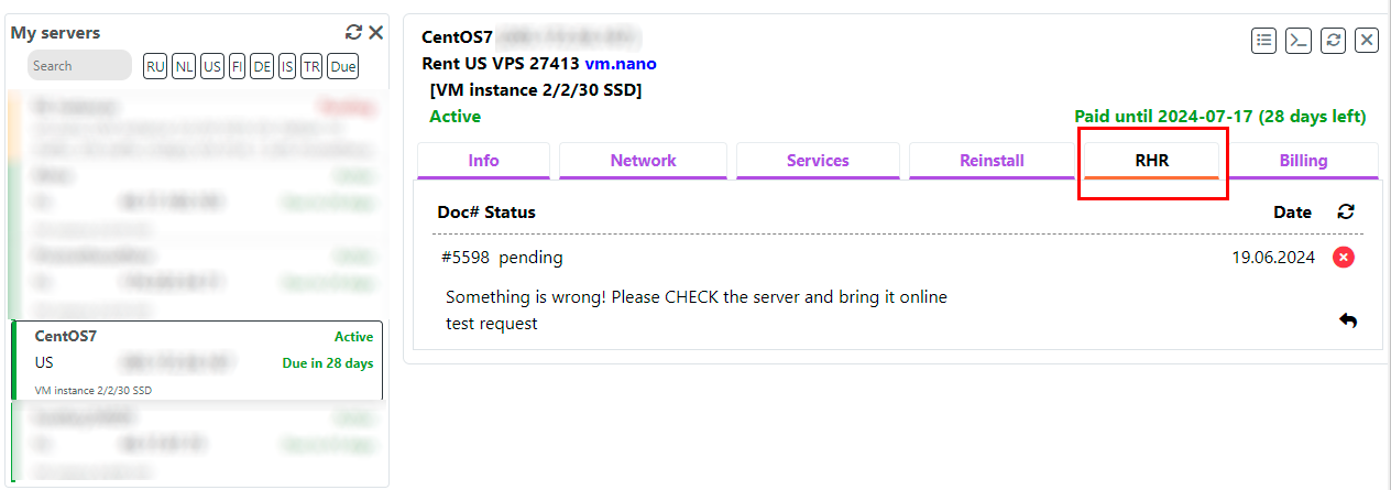 The "Remote Hands Request" (RHR) feature is designed to resolve issues with a rented server (dedicated or virtual) that cannot be addressed remotely through the network. It allows technical specialists at the data center to perform tasks such as connecting external storage devices, diagnosing and resolving equipment malfunctions.