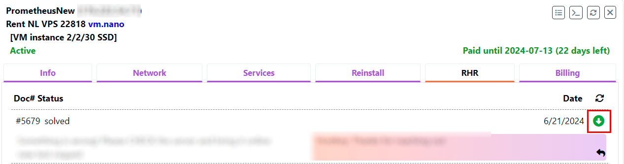 A ticket will then be generated to resolve the issue. Track the status of the request and communicate with technical support specialists in the Invapi server control panel RHR tab. Messages from the company are highlighted in brand colors: