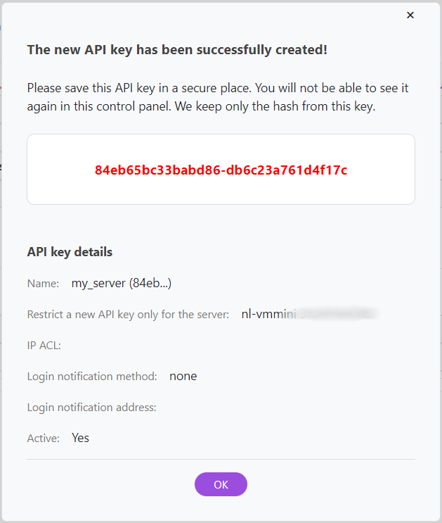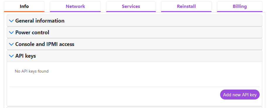 To access the Server Control Panel, which allows server access without logging into your Invapi Control Center account, and to embed it as a standalone module in your billing system to manage HOSTKEY servers, you must generate server-specific API keys.