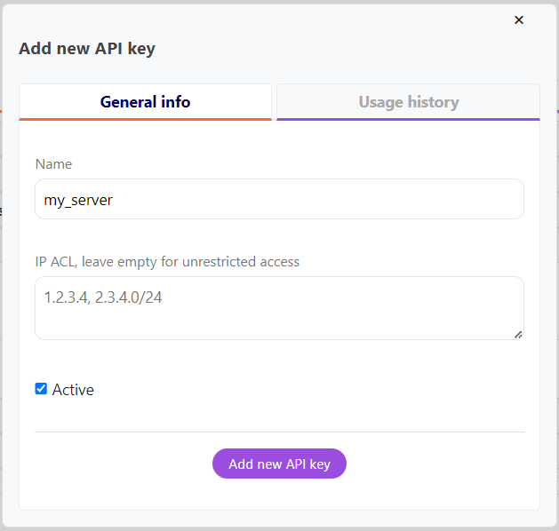 - Specify IP addresses only from which this key will be allowed access in the IP ACL field, or leave it blank for unrestricted access;