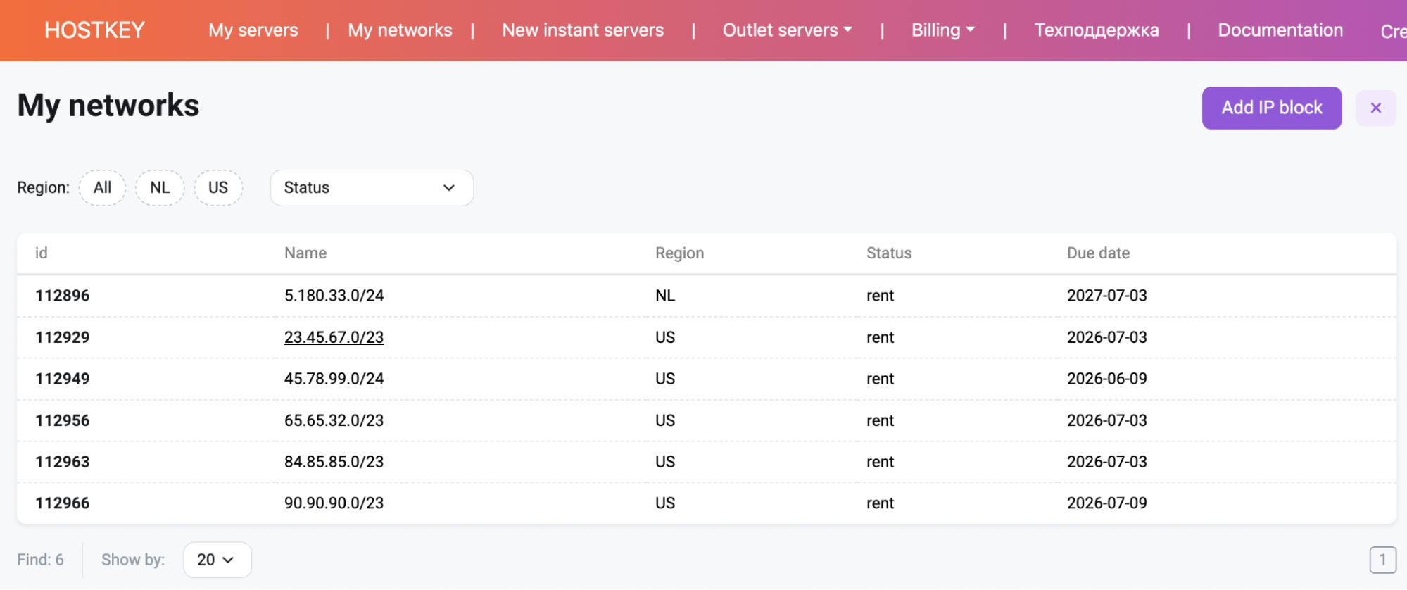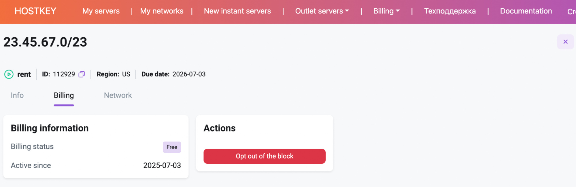 For IPv4 networks, through the My networks menu – send a request to announce the subnet to Invapi. In this case, verification and execution are still performed manually by HOSTKEY technical support.