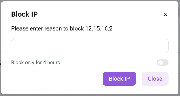 The window offers an option Block only for 4 hours, and you can specify a reason for the block request. The block request is sent by clicking the button Block IP.