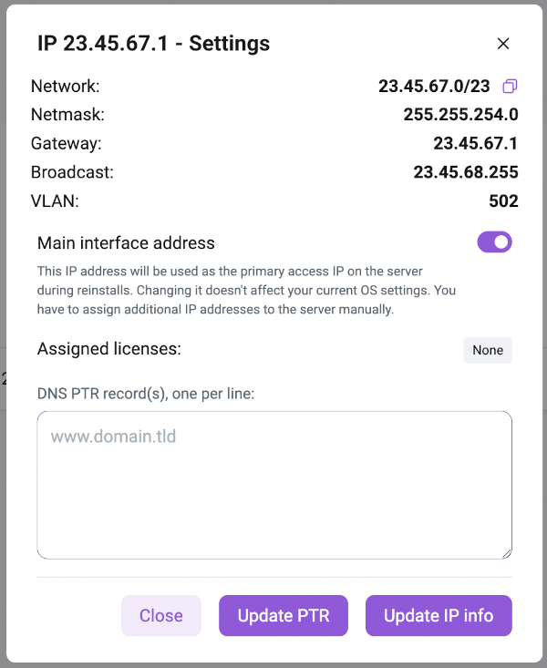 Update IP info; - Add, modify, or delete PTR DNS records by entering (or clearing) the corresponding text field and clicking the button