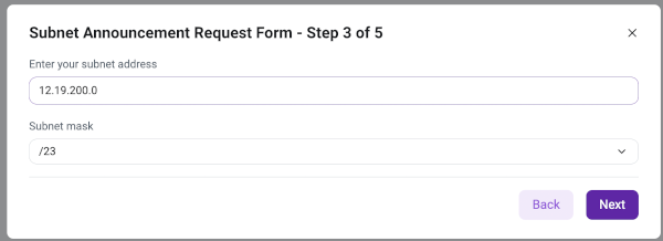 Step 3 - Enter the subnet address, choose a mask (/23 or /24):