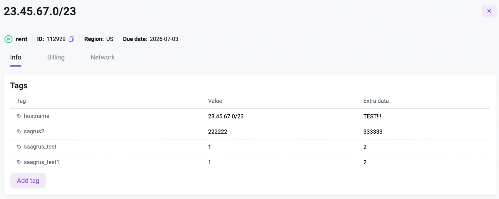 The tab displays a list of network tags.