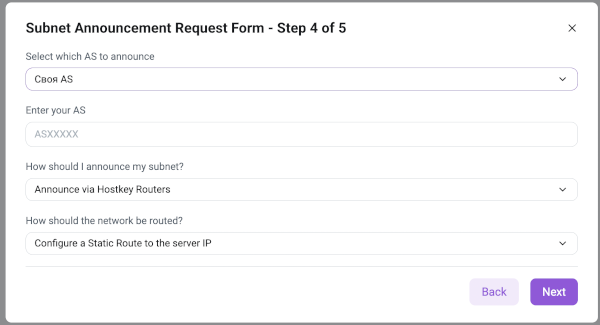 Routing option selection is available only if announce via Hostkey routers is chosen in point 2.