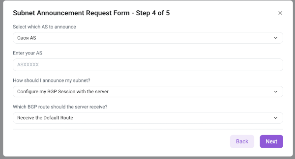 If the announcement method selected is set up a BGP session with the server, step 4 changes again:
