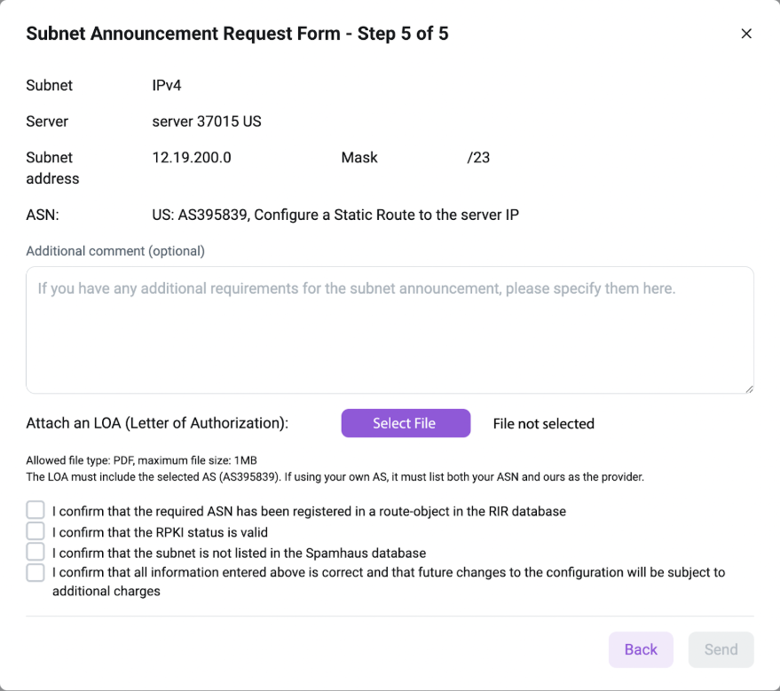 - Attach the LOA file (the LOA must specify the selected AS (AS395839). If your own AS is used, it should be listed along with ours as the provider);