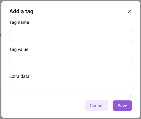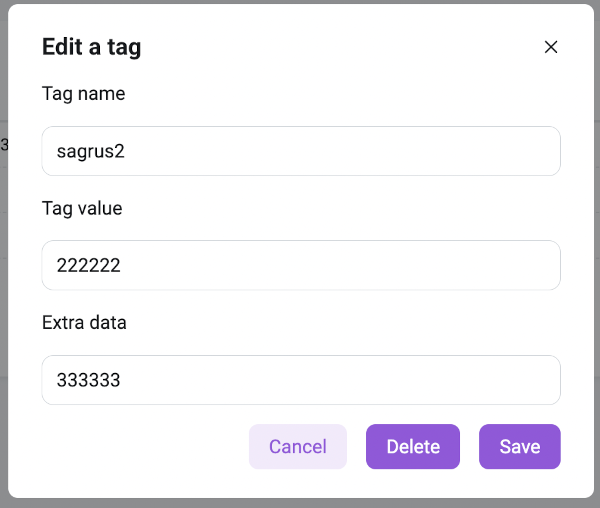 To add a tag: Click on the Add Tag button, then in the pop-up window enter the name of the tag, its value, and additional data (if necessary), and click on the Save button: