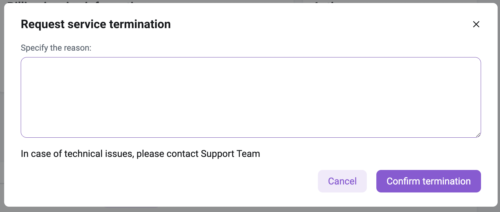 In the block cancellation pop-up window, you can specify the reason for cancellation, then click the Confirm termination button to submit the request.
