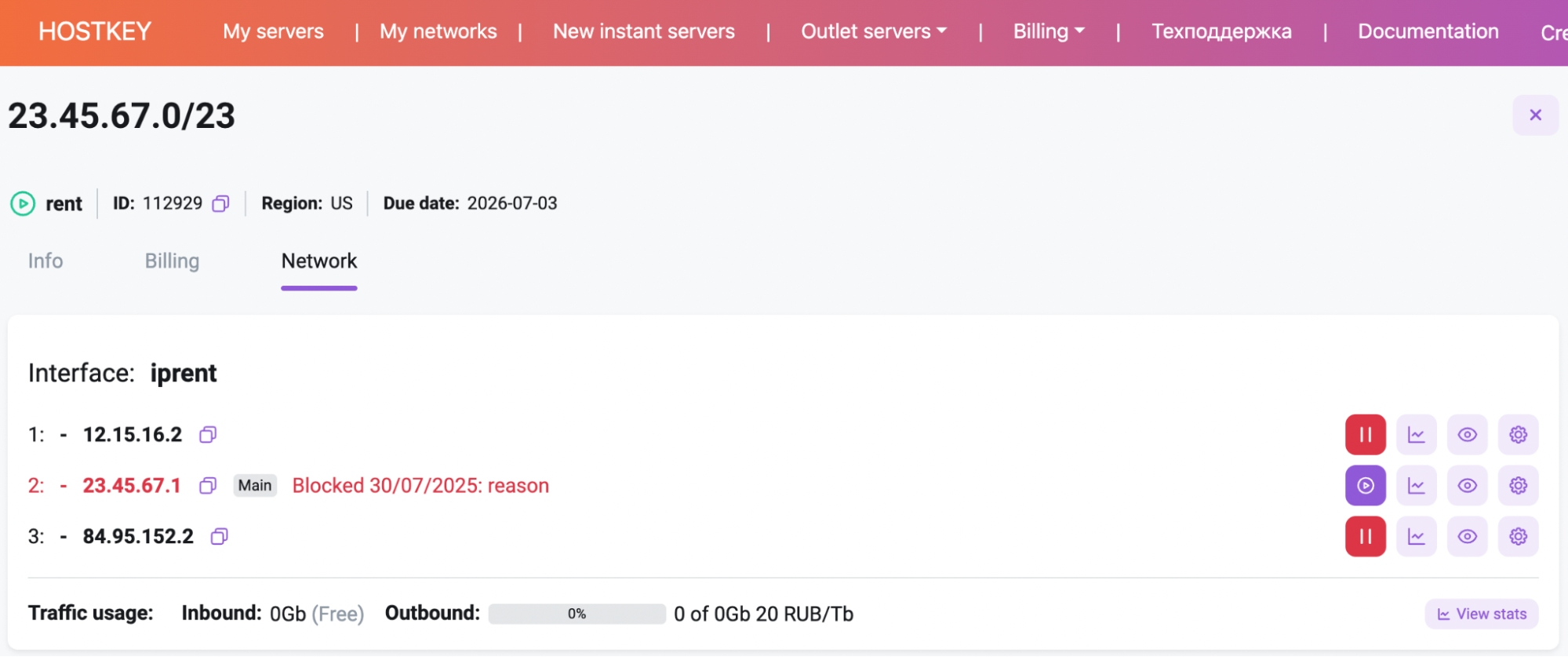The tab displays a list of IP addresses registered in the subnet. Below the list is information about incoming and outgoing traffic usage (including cost per Tb for paid traffic), as well as a button View Stats, which opens a pop-up window with a table showing traffic usage upon clicking.