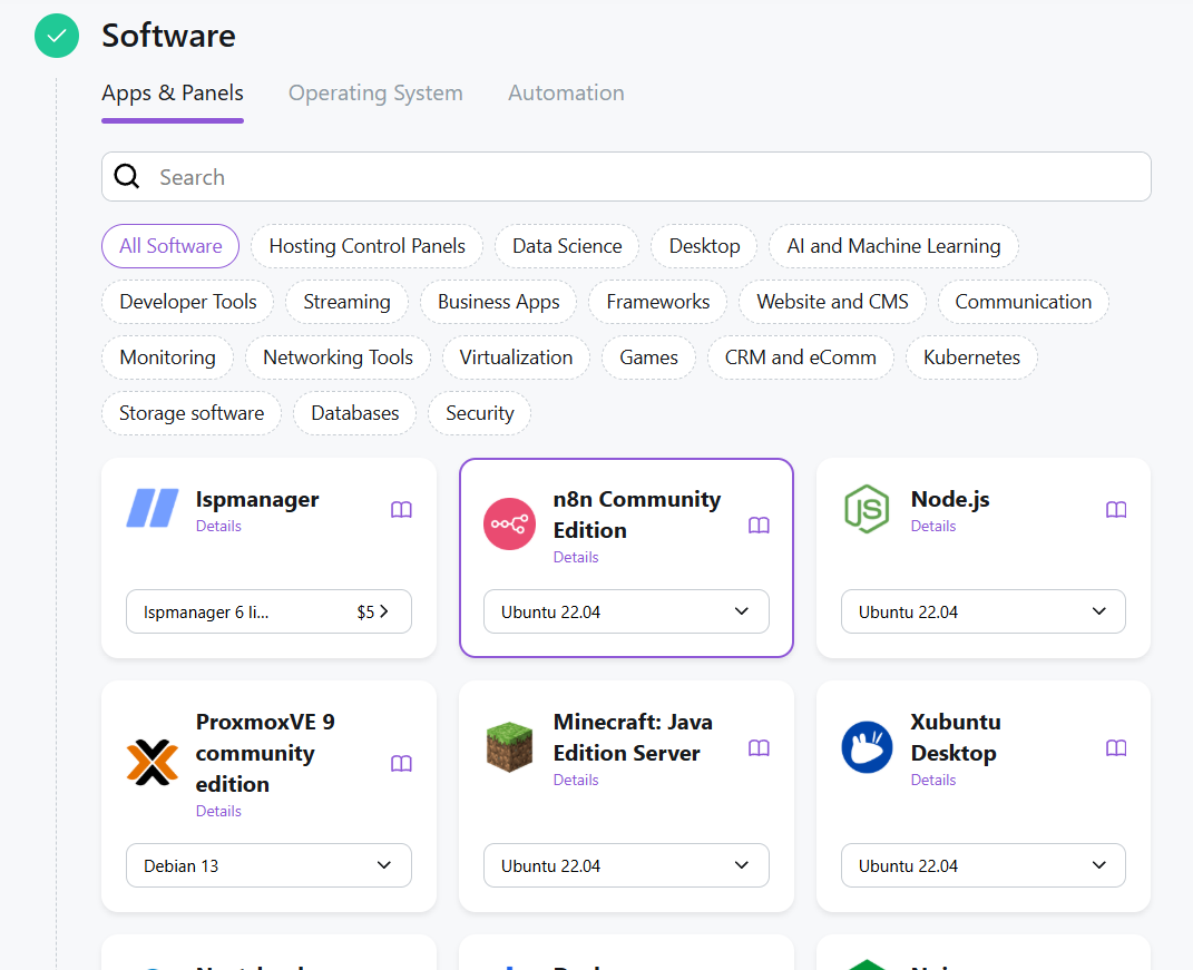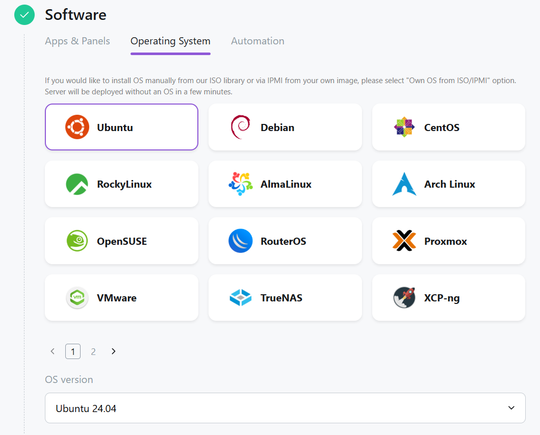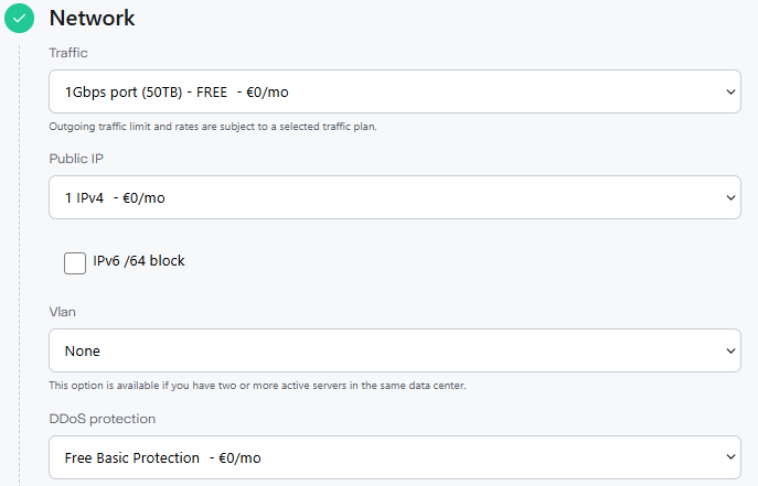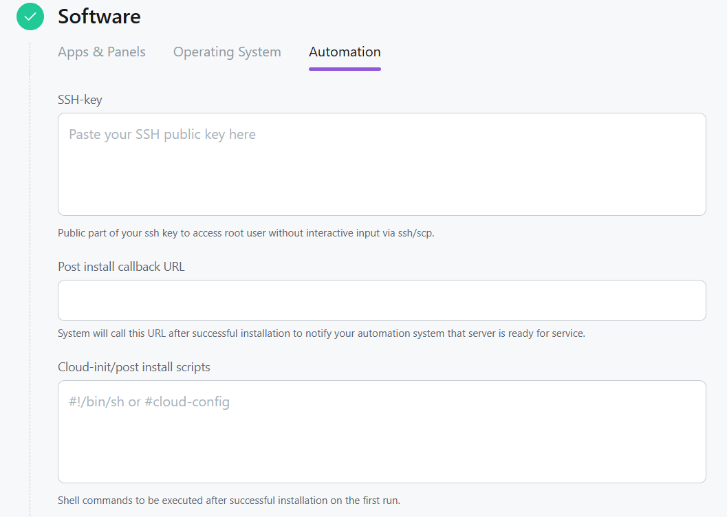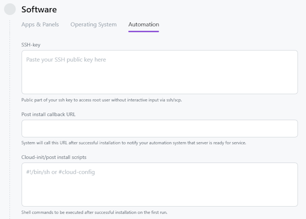 - Software Setup and Additional Parameters — choosing an operating system or application from the Marketplace and additional parameters (SSH keys, scripts, callback-URL).