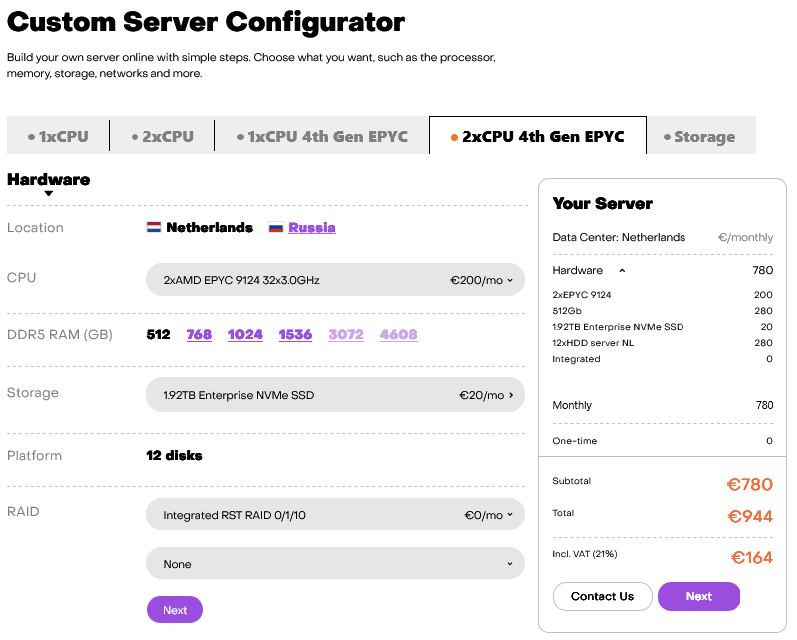 Fully custom server: choose CPU, RAM, disks, RAID, network settings.