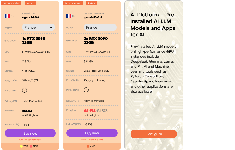 Dedicated or virtual servers with NVIDIA/AMD video cards for machine learning, rendering, and other high-load applications.