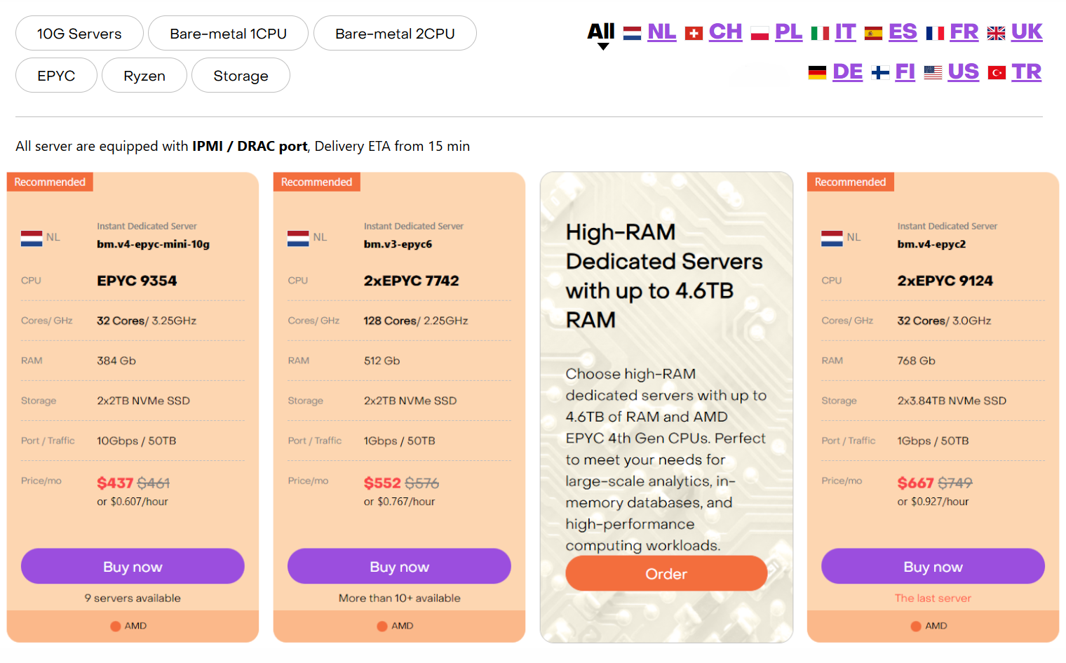 Through the website, you can order the following types of servers: