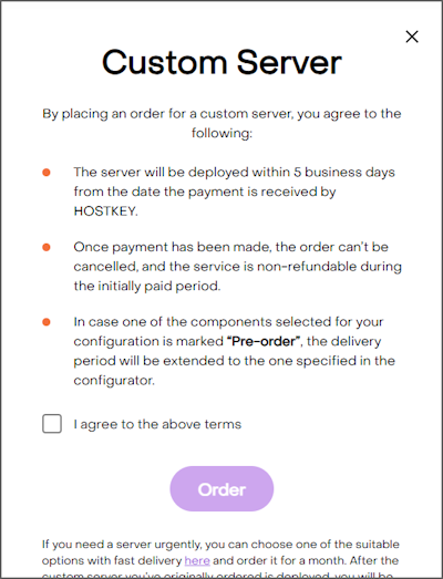 Checkout. - Confirm agreement with the terms of delivery for custom-built servers and click