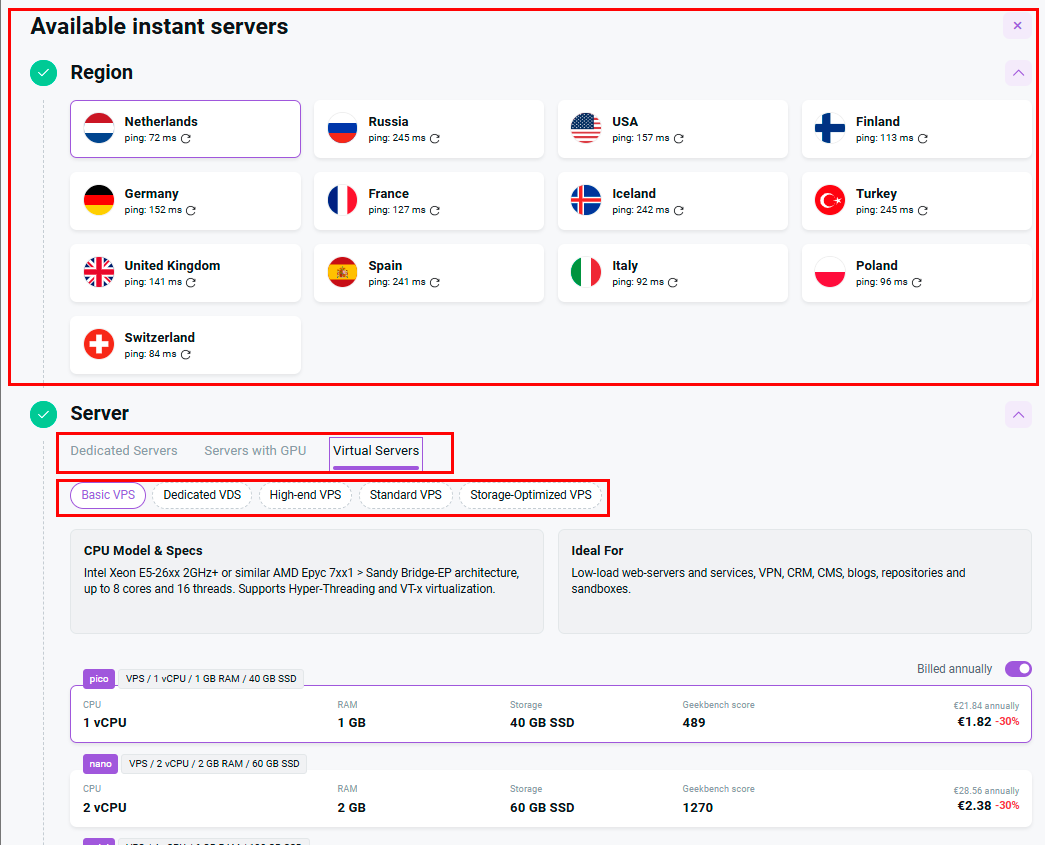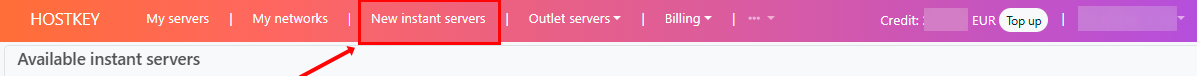 To order a VPS/VDS/Dedicated server, log in to the Invapi control panel. In the top navigation bar, click on New instant servers. This section is designed for online ordering of physical (dedicated) and virtual (VPS/VDS/vGPU) servers with standard configurations. These servers are already rack-mounted and ready to deploy. Installation takes 5 to 60 minutes after ordering, depending on the OS. The entire process is fully automated.
