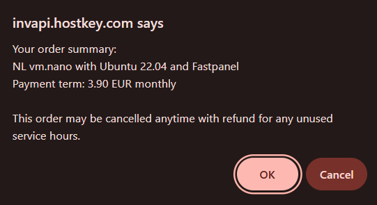 After clicking the Order button, the system will check for server availability and account funds before sending the order for execution, informing of the assigned machine number. During order fulfillment, messages about installation stages will be sent, indicating when everything is ready - a dialog about server readiness will open. After placing an order, the system shows an information window with order details and cancellation options: