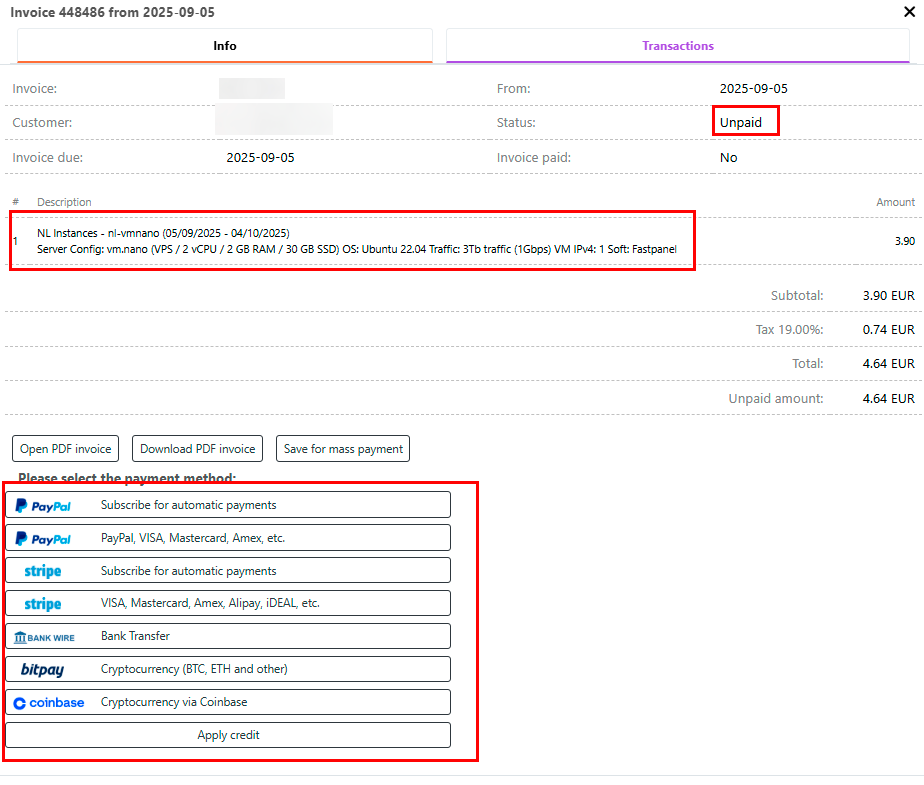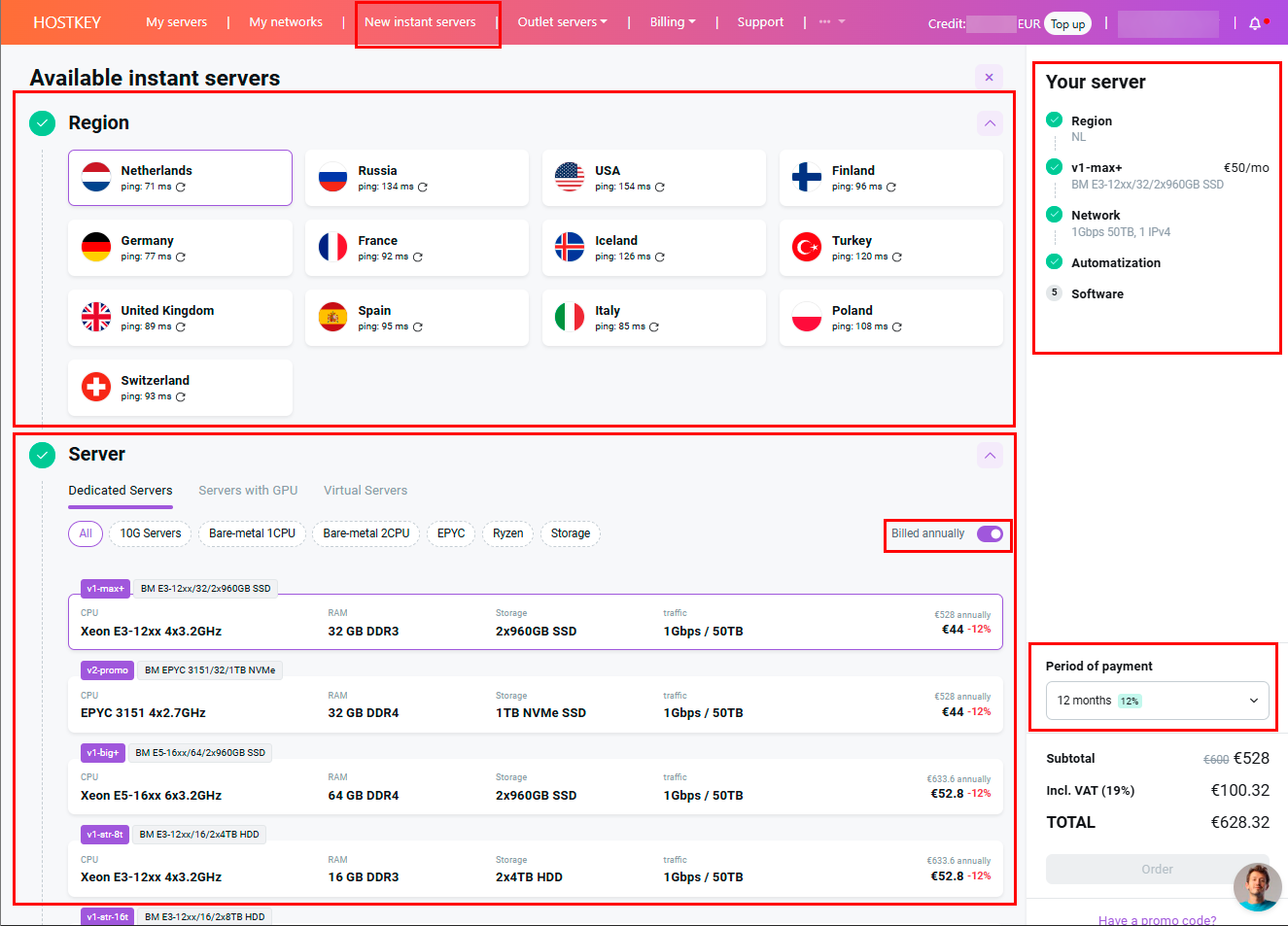 If automatic payment from your account balance is enabled, all payments for instant servers will be automatically charged to the billing credit balance. Ensure there are sufficient funds on your account to place the order.