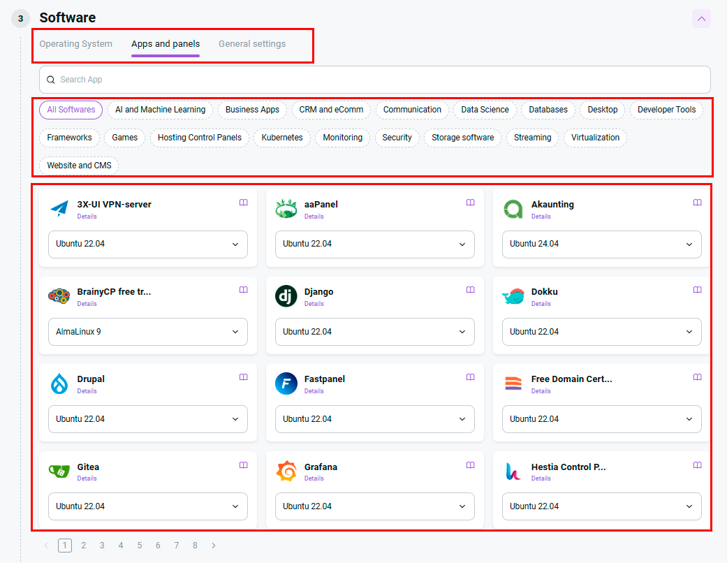 In this tab, you can choose additional software and control panels. For each application, the compatible operating system is indicated (e.g., Ubuntu 22.04, AlmaLinux 9).