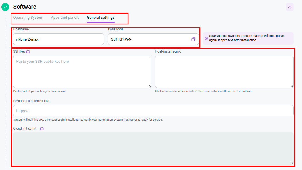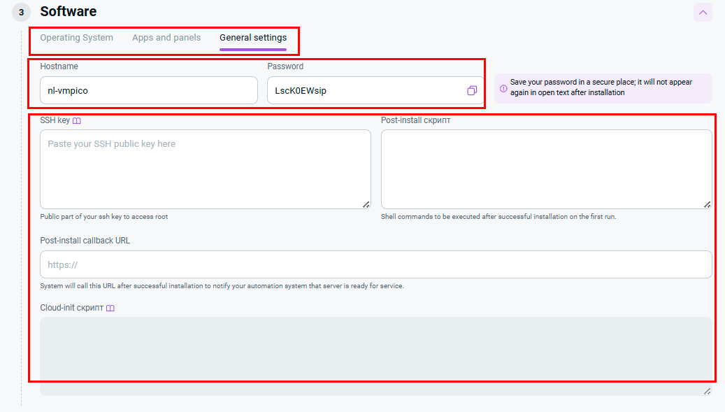 - SSH key - public SSH key of the root user, which will be recorded in the OS;