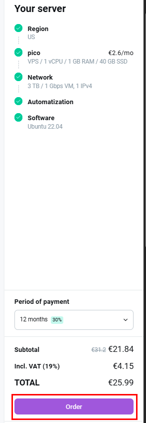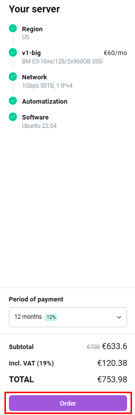 When ordering a server, pay attention to selecting the payment period from the Period of payment dropdown menu on the right panel. This choice is critical for further server management.