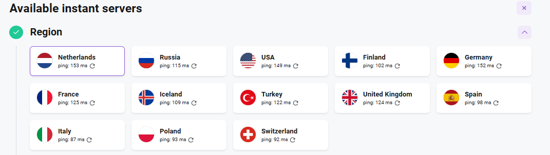 At the top of the page, you'll find the Region section with available locations. For each region, the following is displayed: