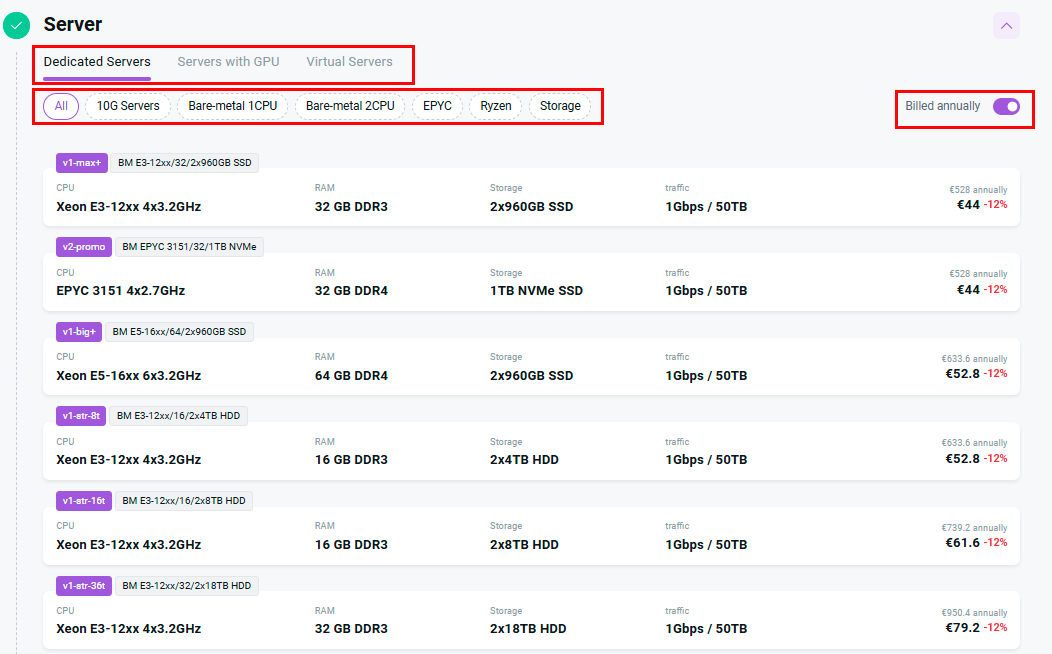 Click on the Dedicated Servers tab to view bare-metal server options. The following filters are available to refine your search: