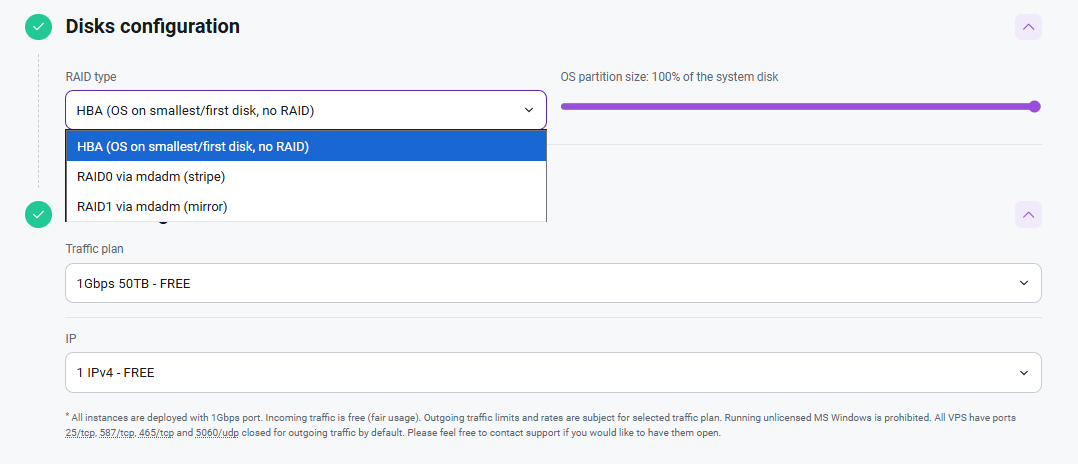 All VPS instances are deployed with 1Gbps port. Incoming traffic is free (fair usage). Outgoing traffic limits and rates are subject to the selected traffic plan. Running unlicensed MS Windows is prohibited. All VPS have ports 25/tcp, 587/tcp, 465/tcp and 5060/udp closed for outgoing traffic by default. Please feel free to contact support if you would like to have them open.