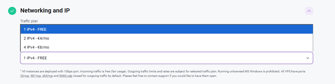 All instances are deployed with 10Gbps port. Incoming traffic is free (fair usage). Outgoing traffic limits and rates are subject to the selected traffic plan. Running unlicensed MS Windows is prohibited. All VPS have ports 25/tcp, 587/tcp, 465/tcp and 5060/udp closed for outgoing traffic by default. Please feel free to contact support if you would like to have them open.