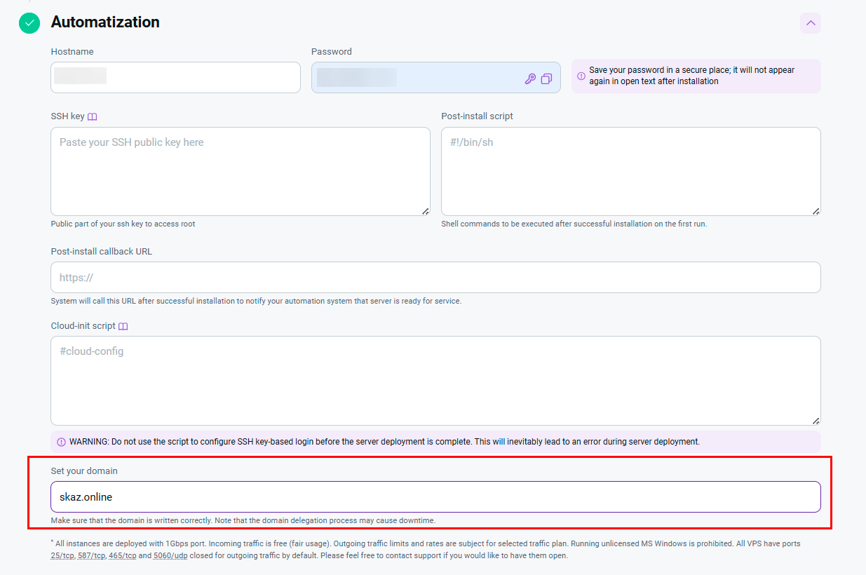 If you have selected a control panel (e.g. n8n, Nextcloud, etc.), you can specify your own domain - the panel will be accessible at your address instead of the default one. Learn more about custom domain setup