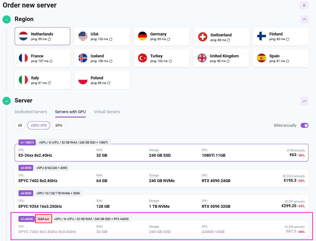 The preorder system allows you to reserve temporarily unavailable server configurations and automatically receives an email notification when the equipment is in stock. Configurations available for preorder are marked with the Sold Out button: