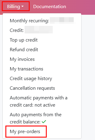 - To check the current status of your preorder, open the Billing menu and go to the My pre-orders section;
