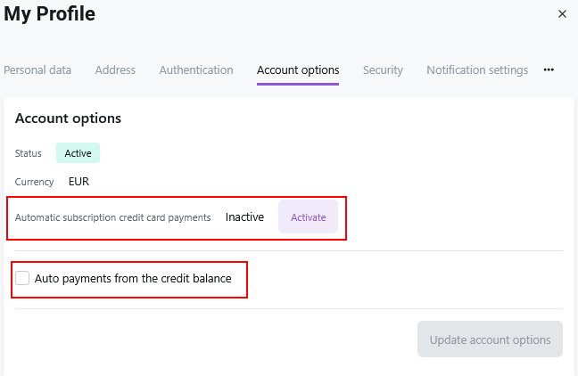 You can also manage the automatic payment option in the account settings section Username >> My profile >> Account options: