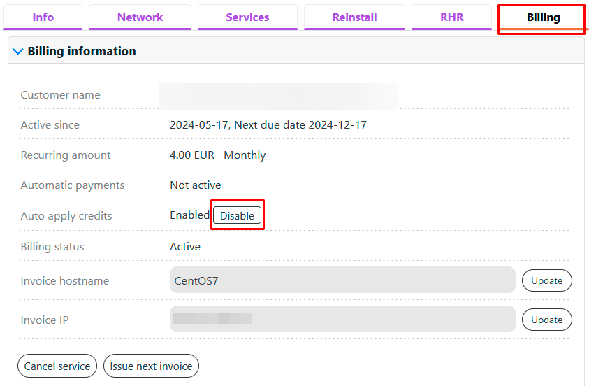 To disable automatic payment for a specific server, go to the Billing tab and click on the