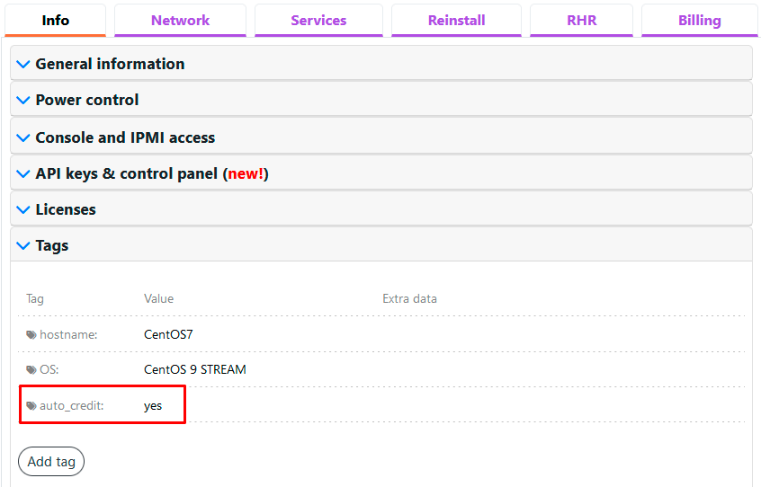 An alternative way to enable automatic payment for a specific server is to add the auto_credit tag. To do this, click the Add tag button in the Tags tab, enter the tag name in the Tag name field, and specify the value - yes in the Tag value field: