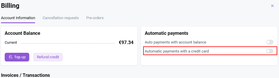 - In the Billing >> Automatic payments tab, toggle the Automatic payments from bank card switch