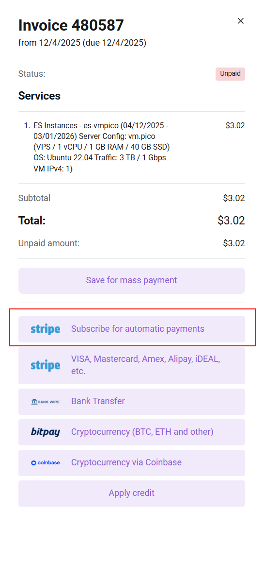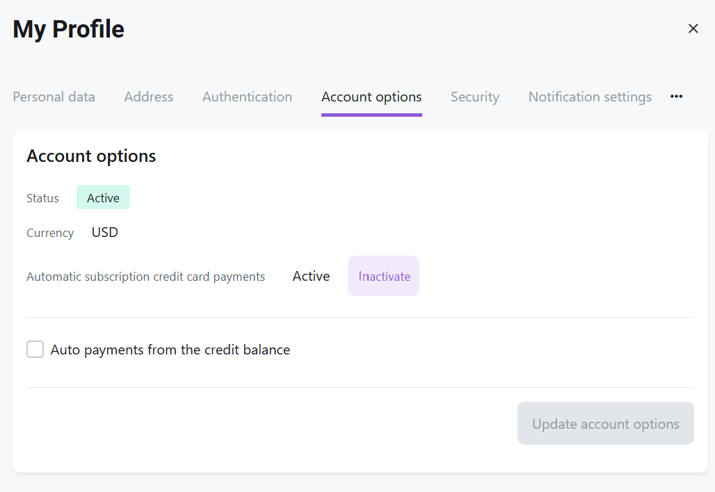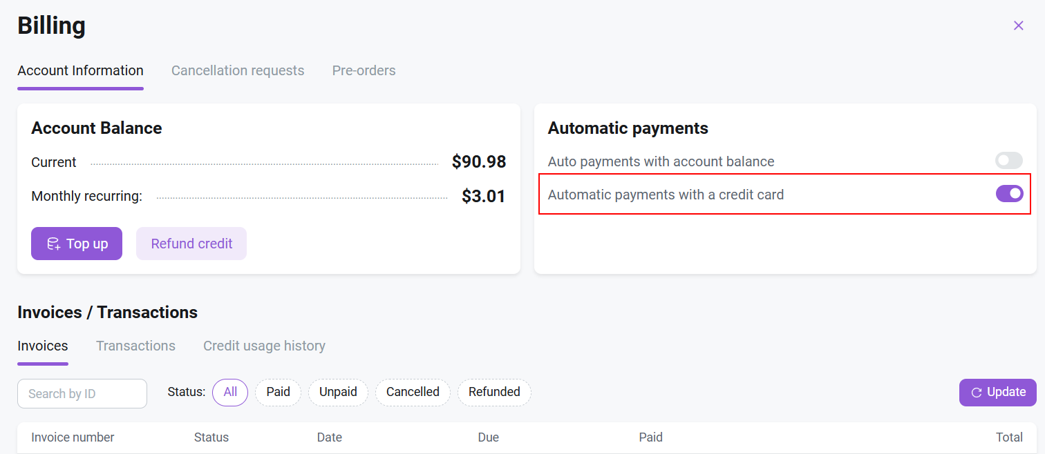 When auto‑payment is enabled for an account, all active services will be paid automatically. Auto‑payment for a specific product allows you to automatically pay invoices for the renewal of individual services.