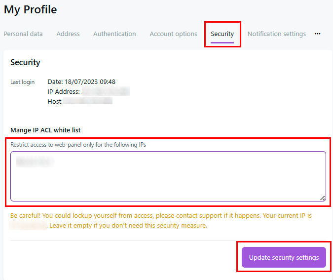 While managing IP ACLs, you should carefully check the data, as entering an incorrect IP address may block access to the server. The lock will be valid for the new token next time you log in. In case of such a problem, please get in touch with our technical support.