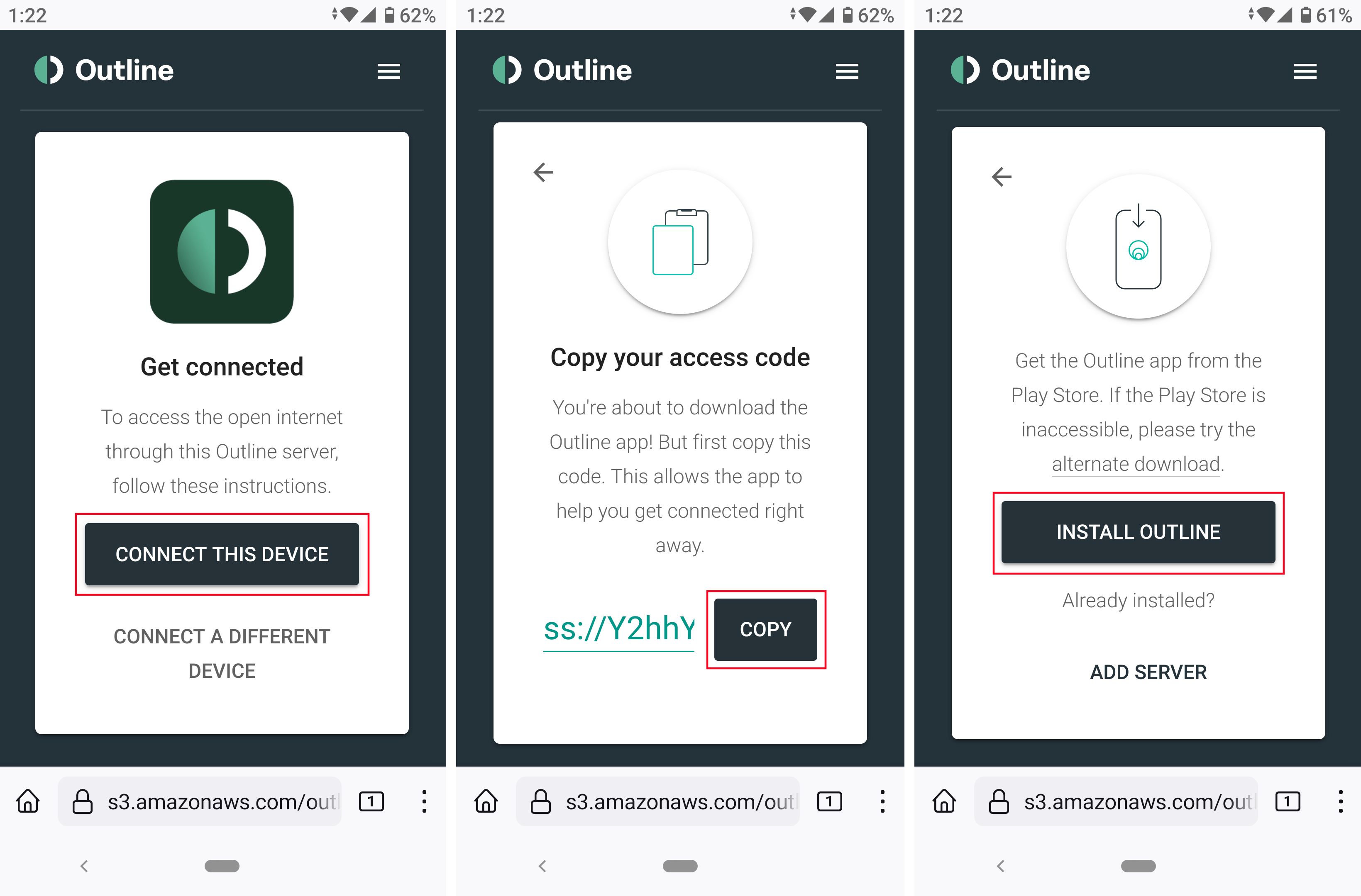 To connect to the VPN server, open the unique link from the invitation in your browser, click Connect this device, copy the access code and click Install Outline if the client application is not already installed (otherwise click Add Server):